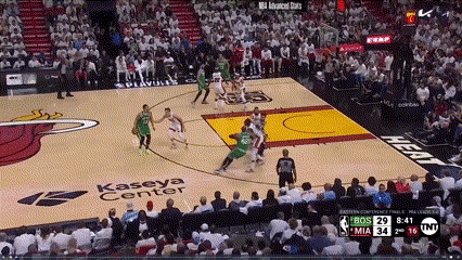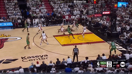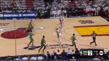 In the second quarter, I liked Miami going to Bam early, getting him a nice alley-oop against Horford within the first minute of action. Miami actually dominated the paint throughout the whole quarter, in no small part to a steady diet of Bam Adebayo. But I really want to highlight some things on the Boston side. First, I liked Horford going back at Bam almost immediately with a quick trigger three at the 9:50 mark. My favorite moment of the quarter occurred two possessions later though. So all season, Boston has run this play where a swing pass from the wing to the top of the key triggers a double pin-down for players in the corners. It looked like they were setting that up, but they threw in some spice. Tatum set a pin-down for Horford to fly out of the corner, but Horford quickly planted a screen for Tatum to turn the whole ordeal into a pistol action. The play is nearly identical to its original recipe, but it had just enough difference to get Horford an open look from deep. I hope Muzzulla can keep up the creativity. It was hands down my favorite sequence of the quarter. Oh, and just to sweeten the deal, even though Horford missed the shot, the Celtics were still able to get a bucket off an offensive rebound. Chef’s kiss.