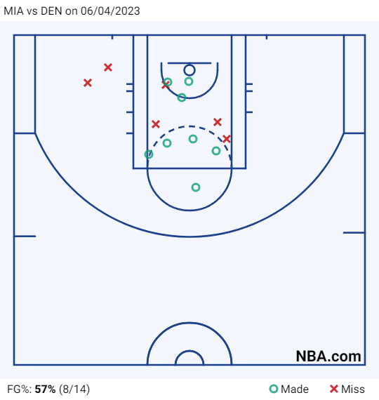 Those makes around the free throw line were the results of great looks out of P&R when receiving a pocket pass. He absolutely killed the Nuggets with just roll actions. Miami really capitalized on Jokic’s slow moving feet to get Bam in scoring positions out of these looks. Great stuff.