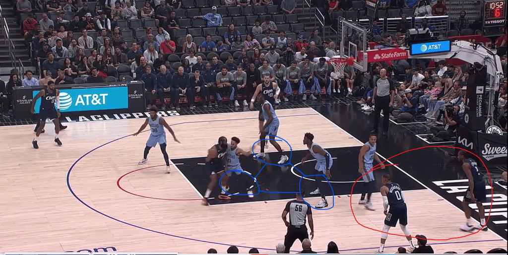 With that said, if your team doesn’t score in transition, your halfcourt offense has to be top tier. In the modern NBA, a top tier system is predicated on spacing. If a team cannot stretch defenses, they cannot win. The Clippers have been a prime example in a really unfortunate way. Let’s look at another example from their loss against the Grizzlies.